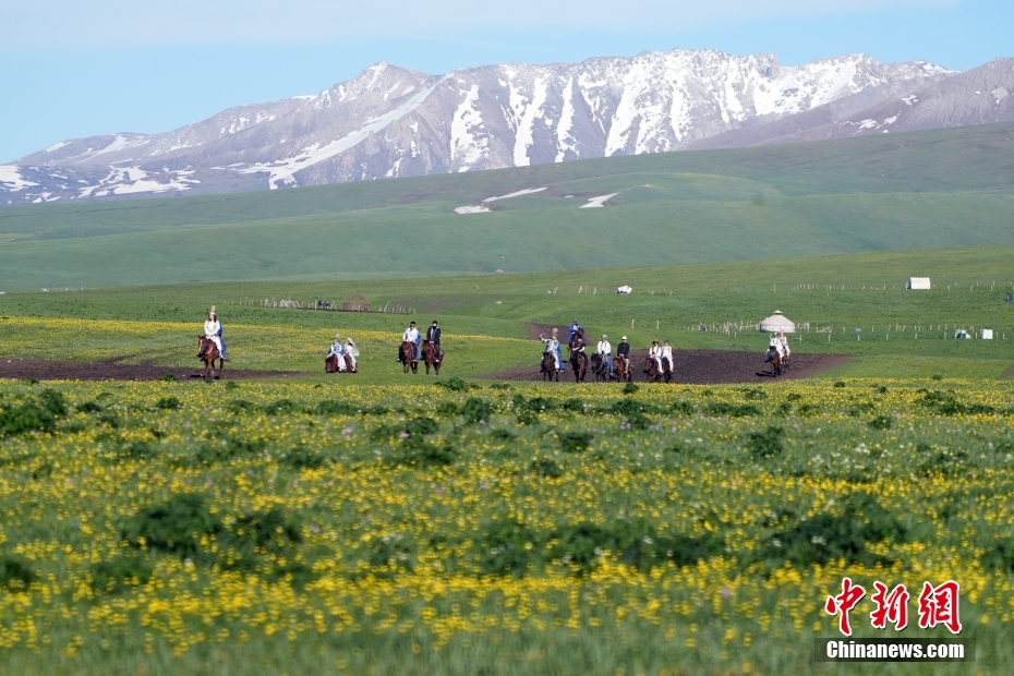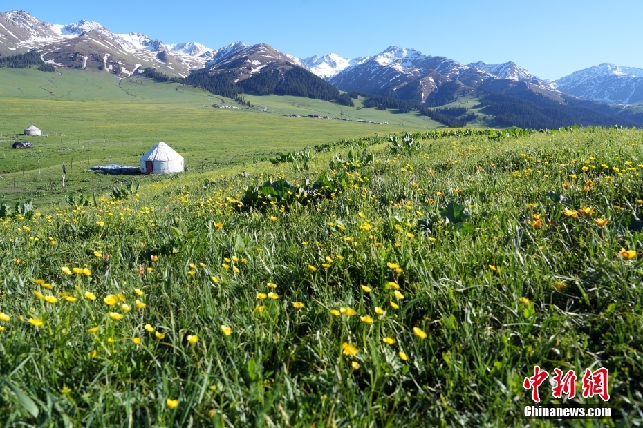 进入五月,位于新疆伊犁哈萨克自治州的新疆那拉提草原进入盛花期,鲜花、草原牧场与远方天山山脉上的白雪构成一幅自然美景,吸引众多游客。据悉,那拉提2024全年接待游客389万余人,同比上升58.46%,其中日接待游客最高达到4.66万人,游客接待量、旅游收入均创历史新高。图为5月13日,新疆那拉提草原美景。(中新社发 毛建军 摄)