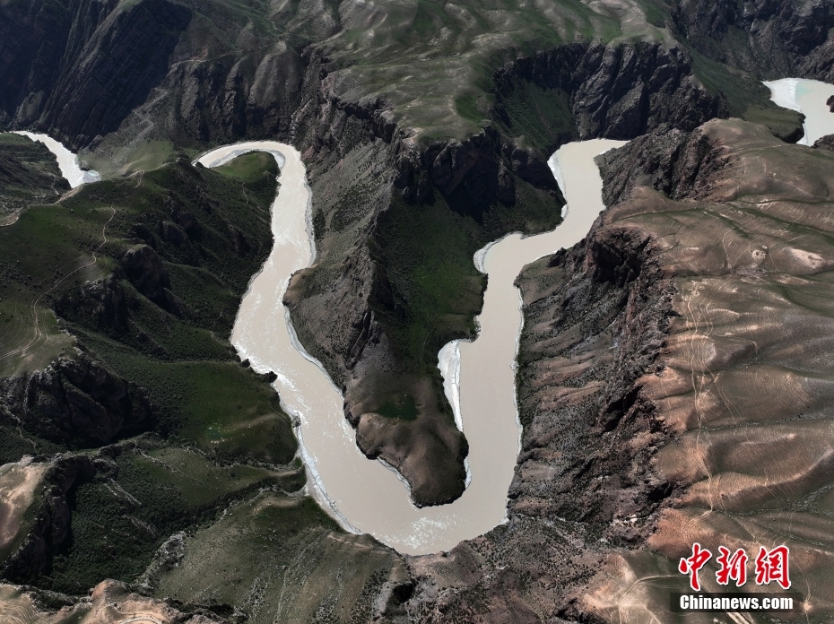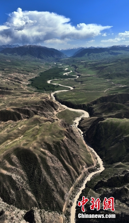 5月17日,新疆喀拉峻阔克苏大峡谷风光壮丽。阔克苏大峡谷是由天山冰川融水冲刷形成的峡谷,两侧崖岸陡峭。(无人机照片) |中新社发 毛建军 摄
