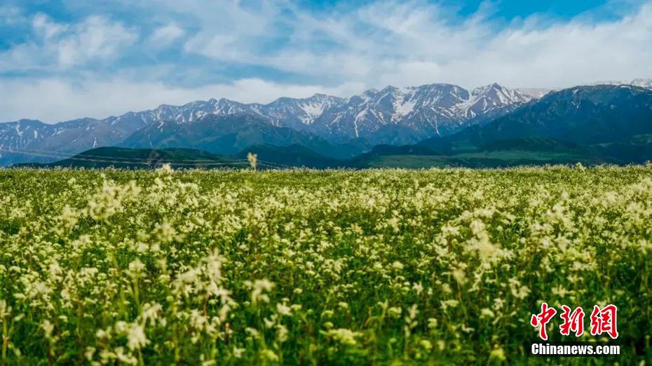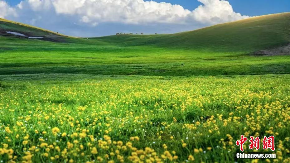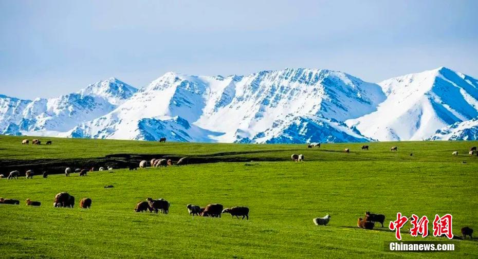 5月下旬,新疆塔城地区裕民县的吐尔加辽草原风景如画。远处的巴尔鲁克山脉巍峨耸立,山顶上的皑皑白雪在阳光的照耀下闪烁着晶莹的光芒,山脚下的草原像是一块巨大的绿色绒毯,一直延伸到天际。草原上,五颜六色的野花竞相绽放,成群的牛羊在悠闲地吃草。身处其间,仿佛置身于画卷,让人流连忘返。(叶尔生·居马哈孜 摄)