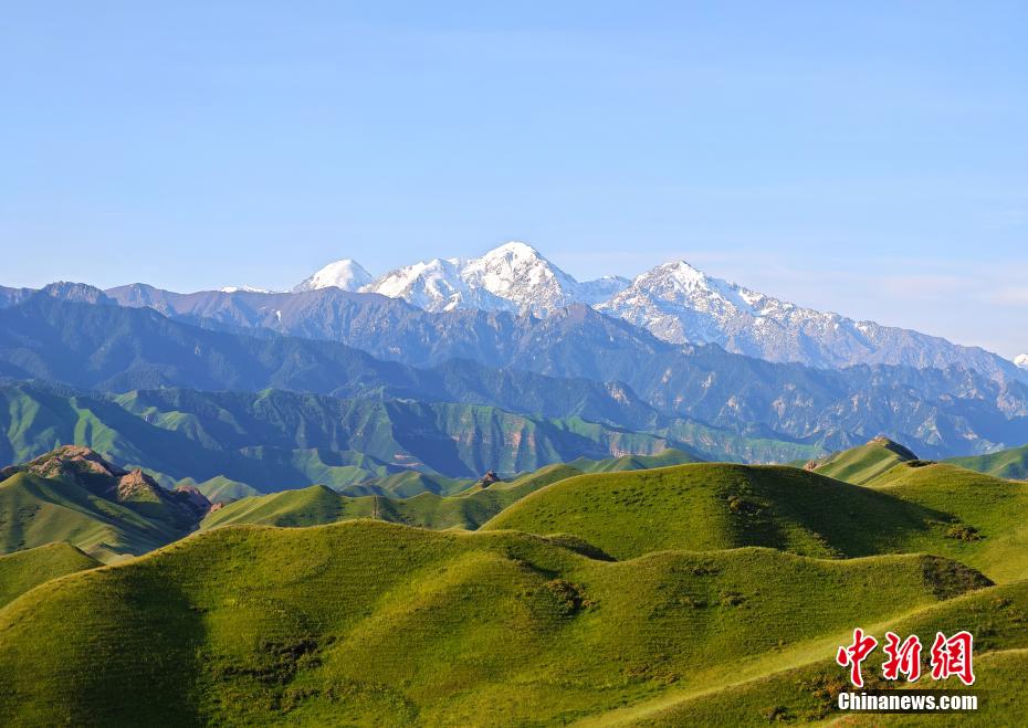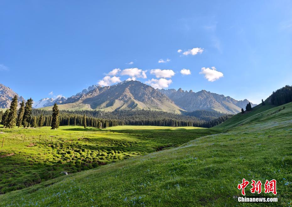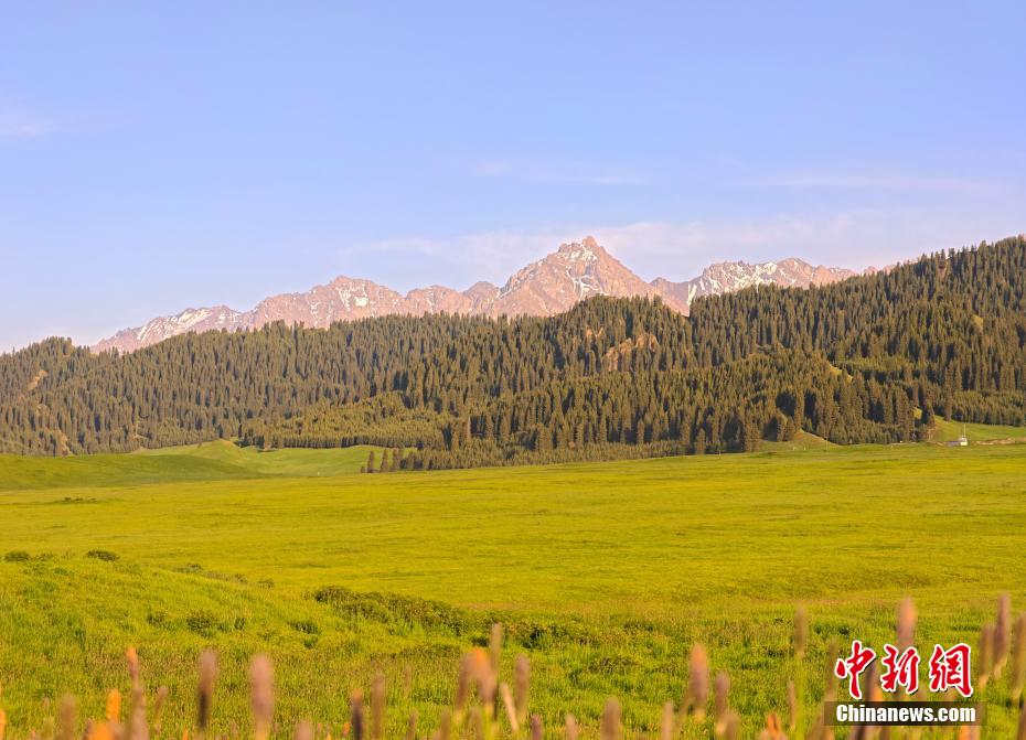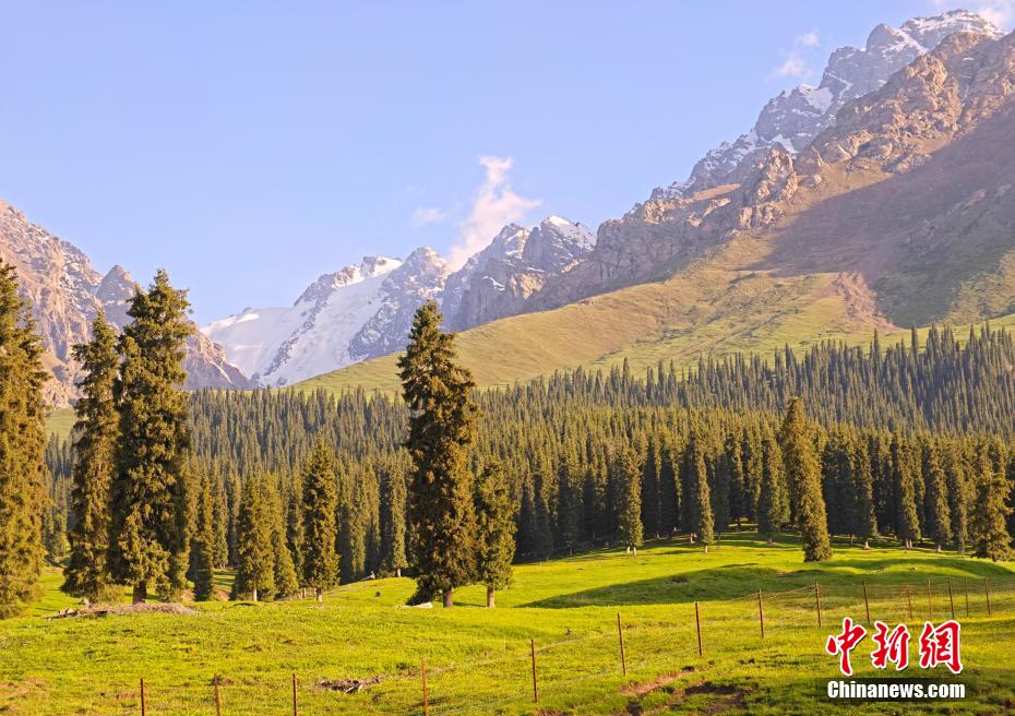 进入6月,新疆天山深处充满着勃勃生机,雪岭云杉草甸进入最美观赏季。青翠起伏的草甸、苍劲葱郁的云杉与远处的雪山层次分明地交织,形成一幅幅壮美画卷。(史玉江 摄)