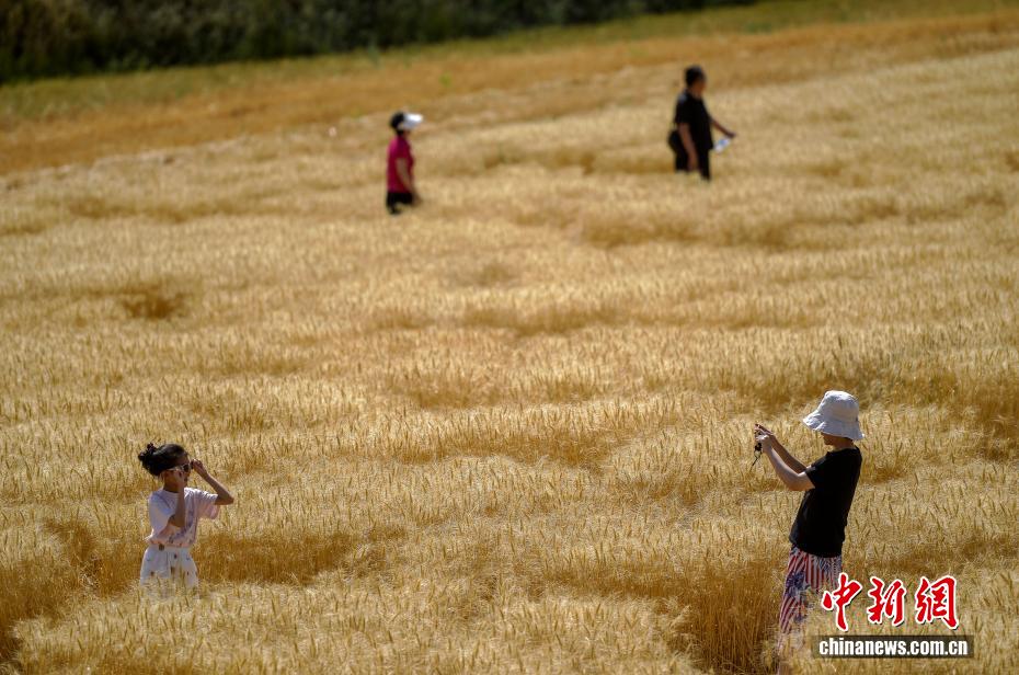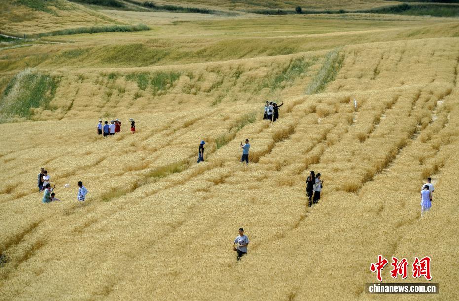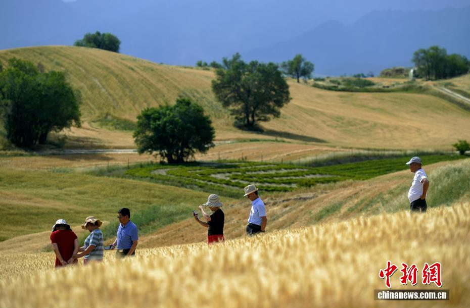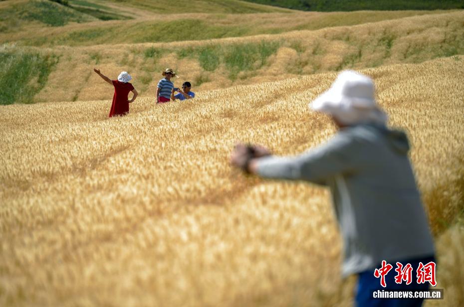 7月25日,新疆奇台县,天山脚下的江布拉克景区万亩麦田陆续成熟,金色麦浪随风起伏,吸引众多游客前来观赏游玩。江布拉克的麦田主要分布在海拔1700米的前山和丘陵地带,受雨水浸润,无需浇水。每年麦田成熟季节,远远望去,金黄一片,蔚为壮观。(中新社记者 刘新 摄)