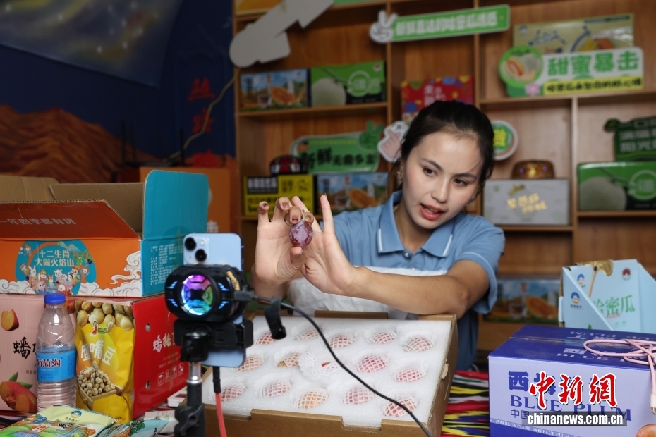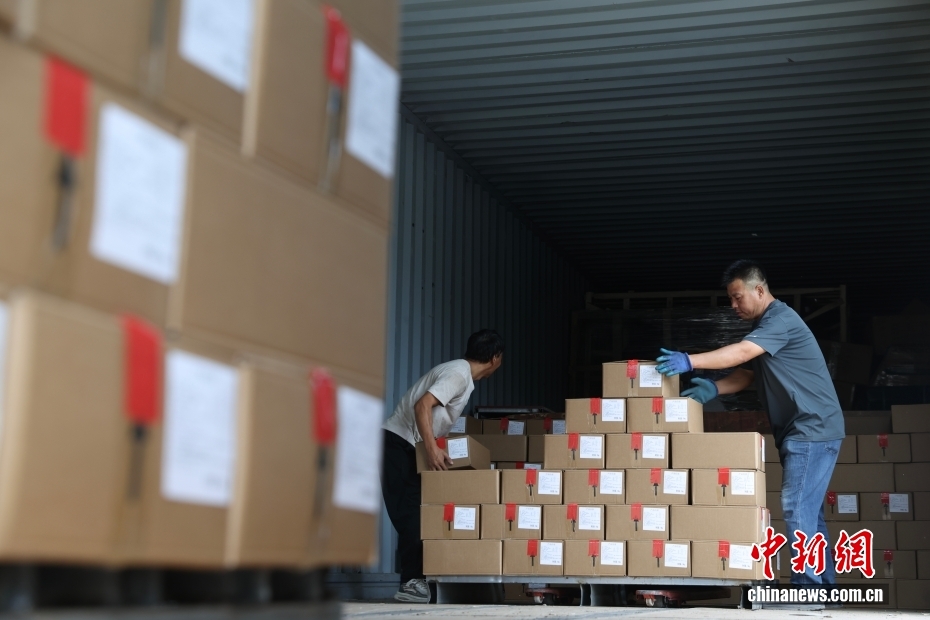 9月10日,在位于新疆吐鲁番市高昌区新城西门村的丝路骄子电商商务有限公司,工作人员搬运快递。目前,新城西门村已经引进两家电商公司入驻,通过线上平台,让特色农产品销往全国各地,助力当地经济发展。(中新社记者 王紫儒 摄)