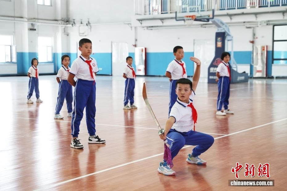 9月11日,新疆哈密豫哈第三实验学校学生在练习武术。豫哈第三实验学校是河南援疆项目,学校立足豫哈融合特色,设有中医本草馆、古筝馆、围棋馆、书法馆、国画馆和戏曲教室等特色场馆,为学生提供了多元化的学习和兴趣培养空间,助力学校学生的全面发展。(中新社记者 王紫儒 摄)