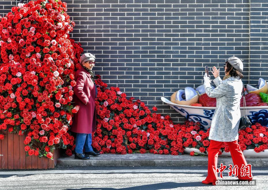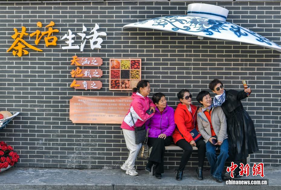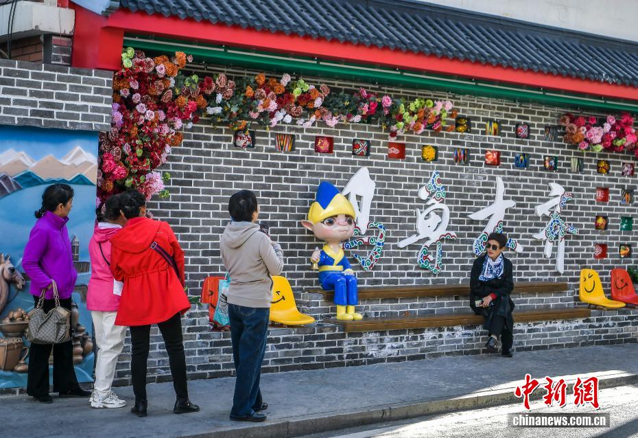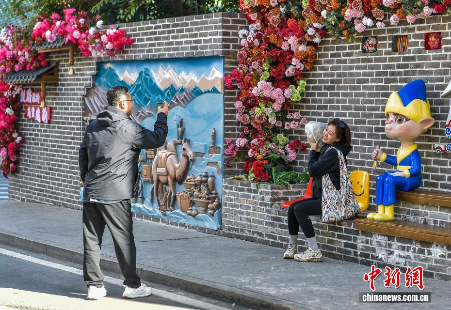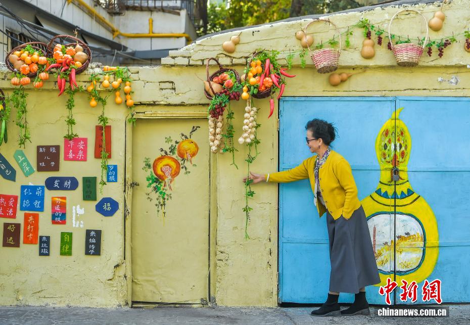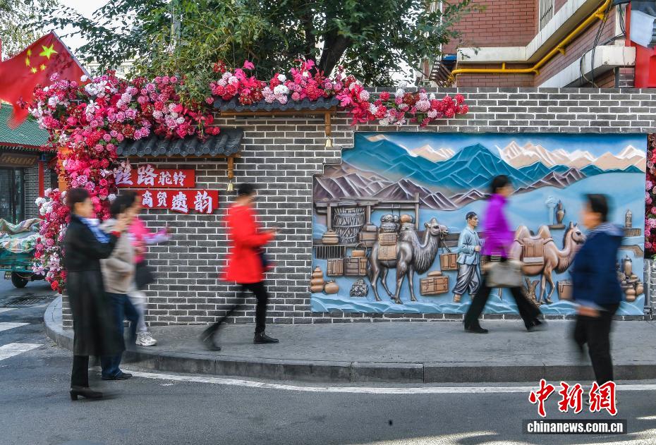 10月10日,新疆乌鲁木齐市永和巷,游客从巷道中的文化墙前走过。永和巷是乌鲁木齐市的一条老巷道,也是美食聚集地,周边分布众多文化、旅游、金融等场所。提升改造后的永和巷,新增6处中华传统文化和当地民族特色的打卡点、文化墙以及4个休闲小广场,成为市民及游客的打卡新地标。(中新社记者 刘新 摄)