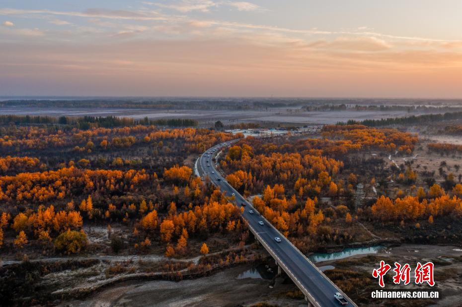 每年10月下旬至11月初,是新疆喀什地区莎车县叶尔羌河流域胡杨林最佳观赏期。金色胡杨与蓝天、碧水以及翩飞其间的鹭鸟构成一幅动人的生态画卷。(王世鑫 摄)