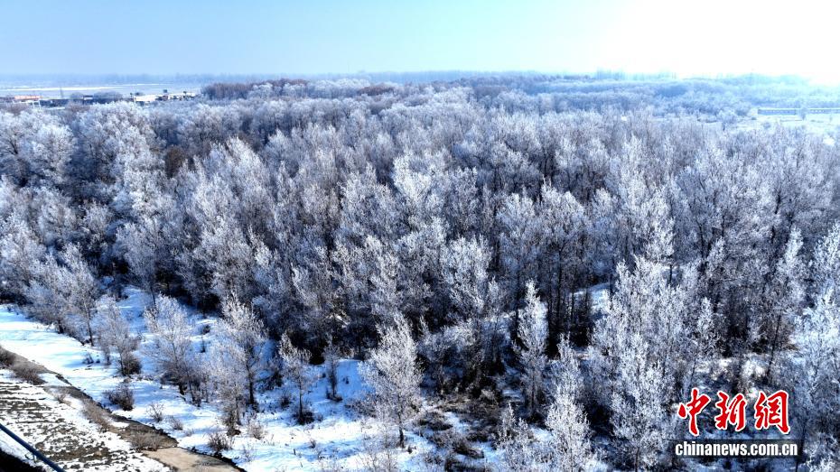 12月24日,新疆喀什地区莎车县叶尔羌河畔出现雾凇美景。连日来,随着气温较大幅度降低、昼夜温差变大,莎车县叶尔羌河两岸出现雾凇美景。放眼望去,千树万树“银花”绽放,漫步其间,仿佛踏入冰雪童话世界。(韩亚伟 摄)