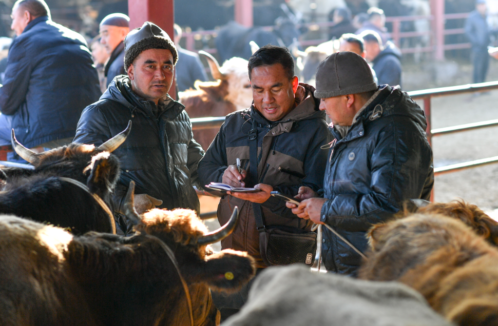 每到交易日,新疆伊宁县最大的牛羊巴扎(“巴扎”意为“集市”)——新疆创锦黄公农产品交易市场(简称“黄公市场”),一大早就开始了,寒冬腊月也不例外。成群的牛羊、马匹“乘坐”各式车辆排队进入这座巴扎,与出售牲畜的养殖户一道早早来到交易场所的,还有“牲畜经纪人”。