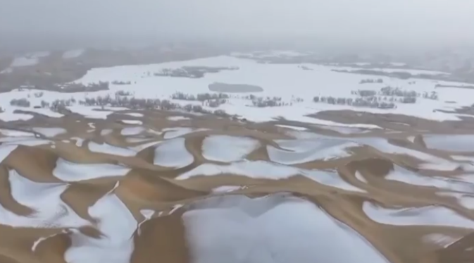 新疆:沙漠降雪披银装 雪落胡杨映沙海